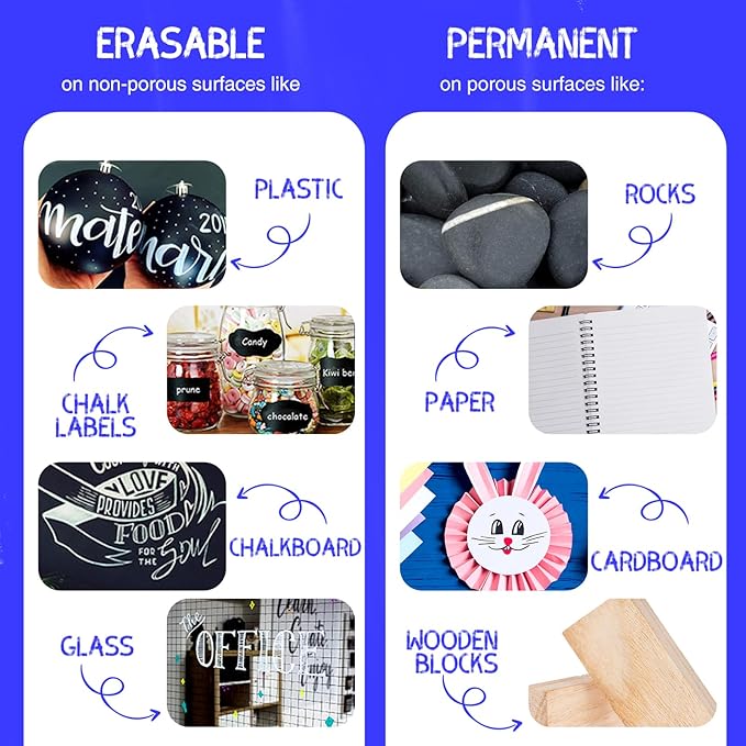 - VERSATILITY ACROSS SURFACES - Make your writing or drawing stand out with Chalk Markers. These brilliant chalkboard markers mark brightly on black boards, light boards, white boards, windows, glass, and more. these jumbo chalk markers prove their versatility on any non-porous surface. Depend on these markers for eye-catching displays or writing in the classroom, your business, or home.Ideal for car decoration, whiteboards, chalkboards, bistro boards, Christmas banners, posters, and various DIY arts and crafts.