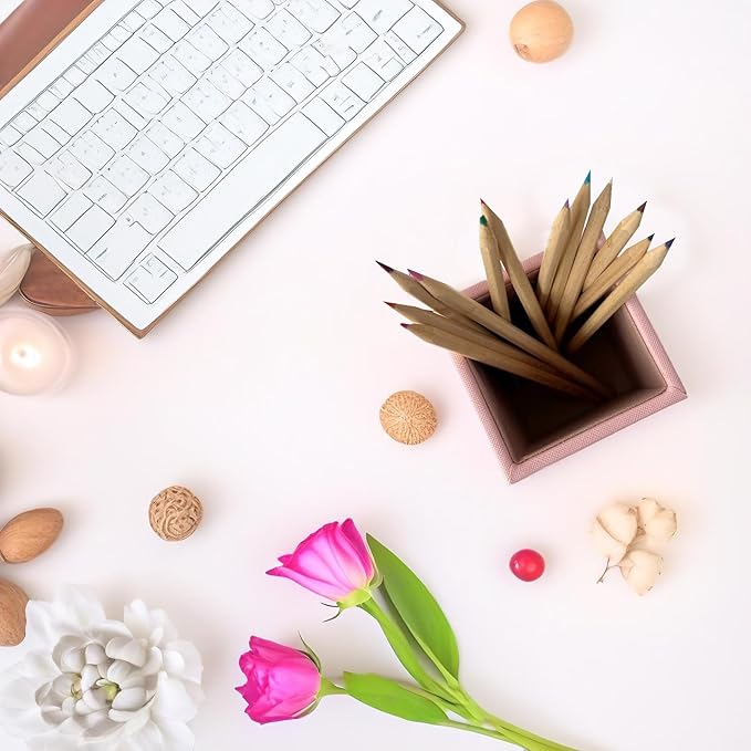 UnionBasic Square Pen Holder, Leather Pencil Cup, Desktop Caddy Stationery Organizer, Taiga Pattern Leather, Pink