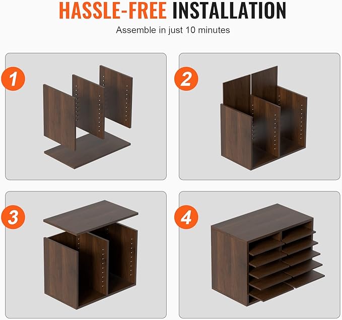- Assemble in No Time: Our literature organizer sorter is incredibly easy to install, thanks to its simple panel design. With the included assembly instructions, you'll be guided through every step of the process, making it a breeze to complete the installation in just 10 minutes!