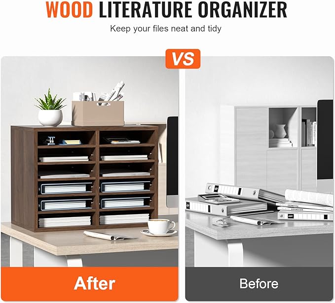 - Maximize Your Space: Say goodbye to cluttered desktops with VEVOR 20.4''x12''x16.1'' wood literature organizer. It has 12 compartments in total, arranged in 6 rows and 2 columns. You'll have ample space to store and organize books, documents, magazines, papers, and other materials. Keep your workspace neat and tidy with ease.