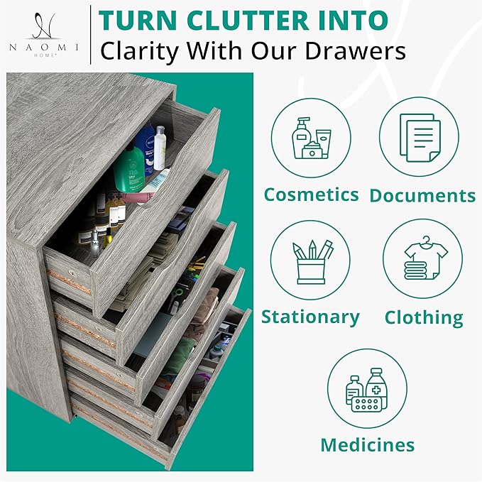 Naomi Home 5 Drawer Office Storage File Cabinet, Under Desk Cabinets for Organization Filing Cabinet with Wheels, Printer Stand Storage, 180 lbs Capacity - Gray Oak 11394AM