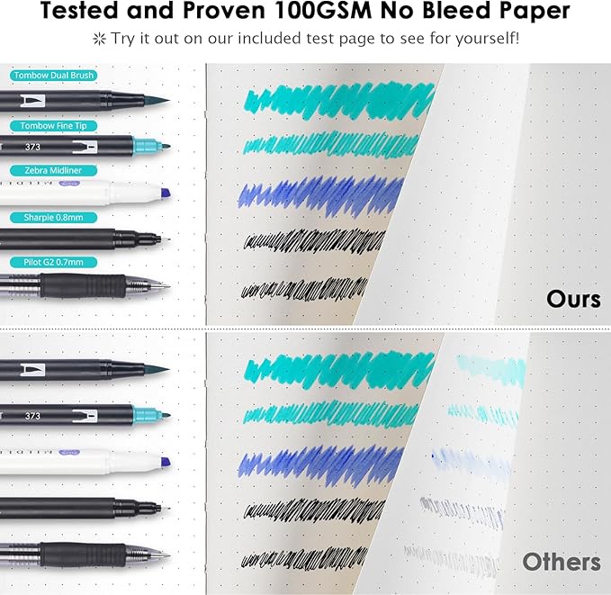 - 【Thick Paper for Writing Without Limits】Large A5 hardcover notebook (5.75"x 8.38"/146mm x 213mm), total 320 pages, includes 312 numbered pages(156 sheets). Each page includes 1107 dots with 5mm spacing: X27*Y41. Our INNOVATIVE PAPER TECHNOLOGY on 100GSM thick paper ensures a perfect canvas for your ideas - no bleed, no ghosting, as confirmed by tests with various pens commonly used in bullet journaling.