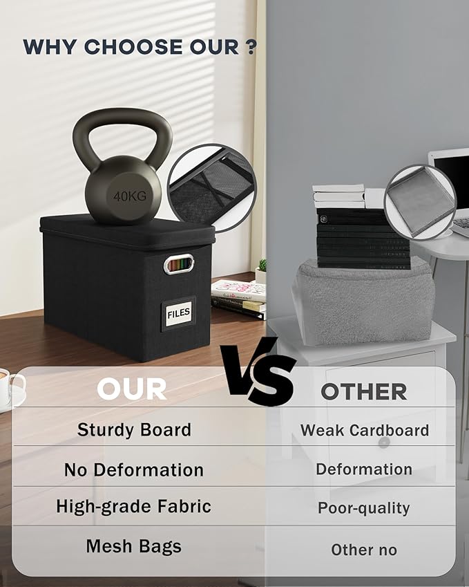 - 【Sturdy & Stackable】Portable storage box is made of well-made linen fabrics and durable material, with good support and bearing capacity, and the box top can withstand 100 lbs. The document boxes can be stacked when in use, or folded for easier storage when not in use.