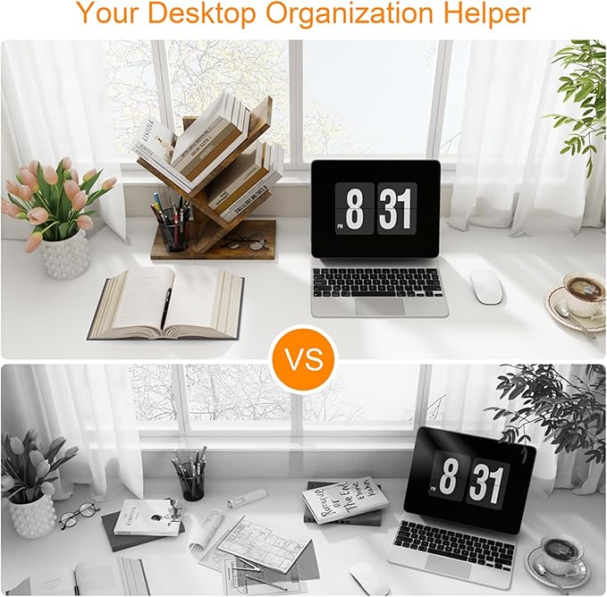 - 【Sturdy Design】The desktop bookshelf adopts the geometric T-shaped design for offering the most stable support. Besides, this small tree bookshelf is equipped with the anti-toppling device that offer additional stability.