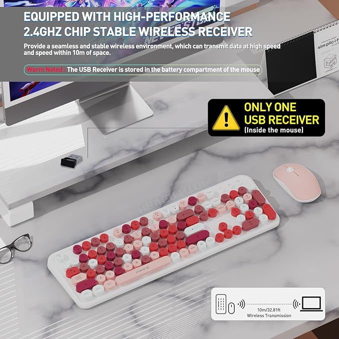 - Cute Wireless Keyboard - Stable 2.4G Wireless Connection : Enjoy a powerful wireless connection with a range of up to 10 meters (393.7 inches) for the keyboard and mouse combo. They utilize a shared Nano receiver, conveniently stored at the bottom of the mouse, Plug and Play.eliminating the need for additional software installation.keeping your desk clean.Keyboard size 17.5 x 5.5 x 1.3 inch With 105 Keys. Mouse size is 4.1 x 2.5 x 1.0 inch. Keyboard net weight: 1.57LB,Mouse net weight: 0.15LB.