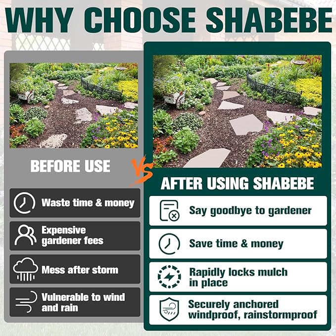 - 【Reliable & Weather-resistant】All Shabebe Mulch Anchor products have a 100% satisfaction guarantee. This mulch adhesive minimizes erosion due to intense rainfall and even prevents leaf blowers from dispersing your mulch. Simplify your life and put an end to the continuous sweeping and maintenance of your landscape!