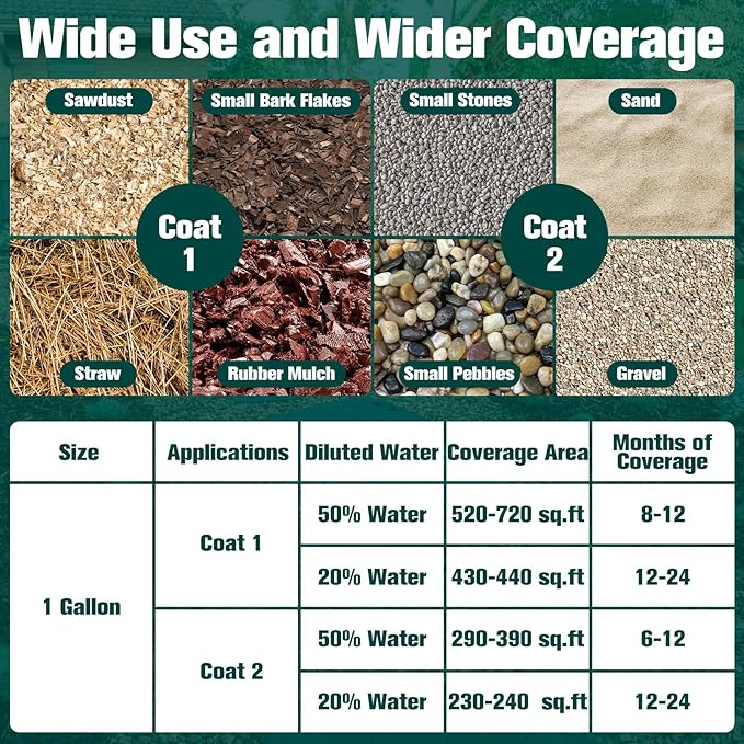 - 【Easy Application 】Strong Mulch glue spray is easy to apply - just shake and pour into a garden sprayer. For small mulch pieces, dilute with at least 10-50% water before using a sprayer to prevent clogging. After the initial application, rake or turn the mulch. We advise applying 2 - 3 coats for optimal results, allowing Mulch Glue Max to fully dry between each coat.