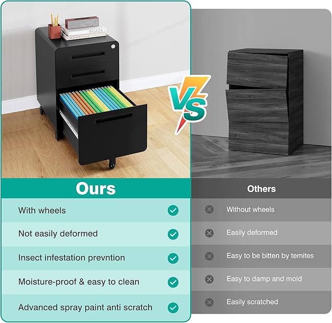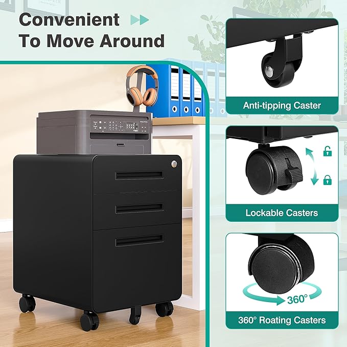 - ✔️☆【Rolling Fill Cabinet 】: Filing cabinet Equipped with 2 lockable casters + 2 x 360° swivel casters + 1x anti-tilt wheel, you can move office cabinet easily and safely. 360° swivel casters go to any direction easily, while lockable casters offer braking and the center support wheel prevents tipping.