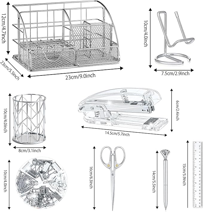 - 【You Will Get】You will get a set of delicate Silver office supplies, including a desk organizer, a stapler, a pen holder, a phone holder,scissors, pen, ruler, 30 paper clips, 22 binder clip, 20 tacks and 1000pcs staples to meet your daily office needs. The large desk organizer has the most reasonable size so you can fit all your stationery.