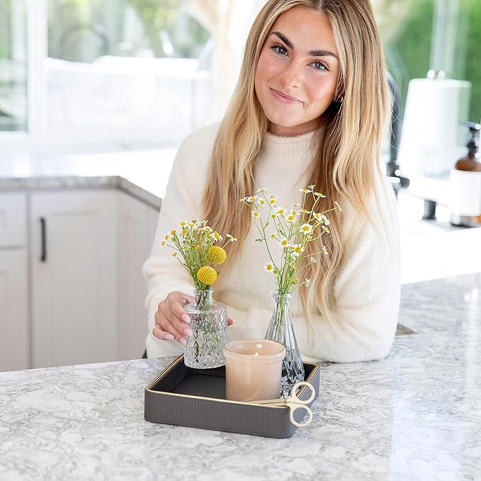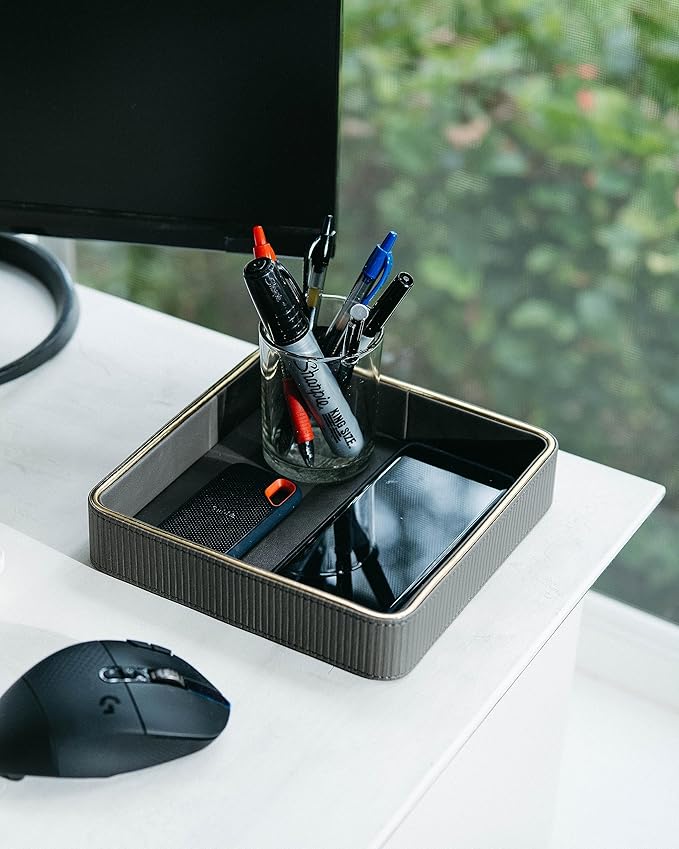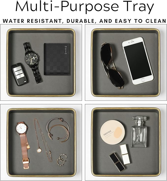 - š Creating Order with Elegance: Our versatile and water resistant gray phone tray key and wallet tray for men and women is tailor-made for your bedside table decor, tray organizer for dresser decor, dresser trays for bedroom or even a remote tray, or catch all trays. This valet tray organizer adds a luxurious decorative touch while keeping everything beautifully in place. Or buy 2 pack as nightstand organizers and put them on each side of your nightstand.