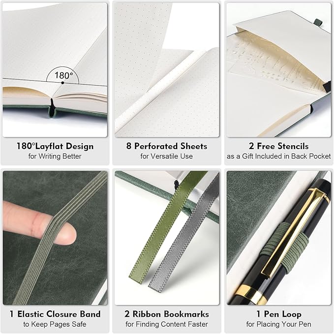 - 【User-Centered Design】❶ Add 2 subtle markers on the pages to assist with QUICK PAGE LAYOUT, allowing you to easily locate the center of rows and columns without counting every time; ❷ Include all the essential features of a perfect dot grid journal, such as 8 perforated sheets, 2 bookmarks, elastic closure band, pen holder, and back pocket; ❸ BONUS - 2 stencils are being gifted to you to create your ideal bullet point journal.