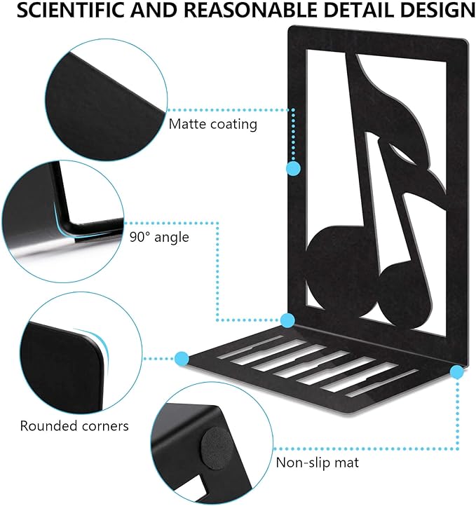 Book Ends,Metal Bookend,Bookend Decorative Heavy Book Ends for Shelves, Home Decorative Bookends for Heavy Books,Non-Skid Musical Note Bookshelf Holder