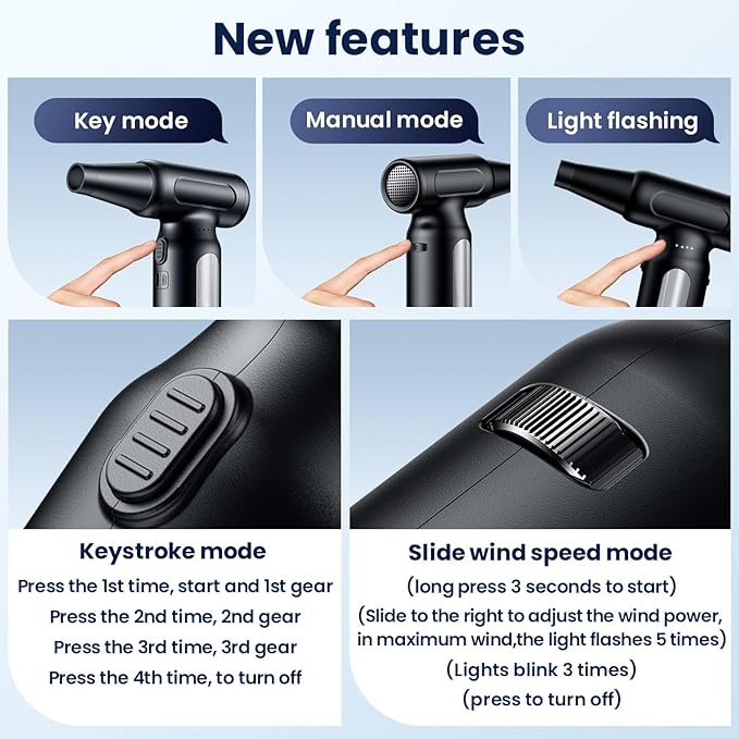 - Compressed air duster【New Pulley Mode Functional Design】This air dusters is new upgraded version, we not only have【 3- gear mode】, but also add a new【 pulley mode】, smooth sliding, more convenient and sensitive to use, you can choose the wind power you need. Aslo, Fan adopting ergonomic design, the handle is more comfortable to touch.