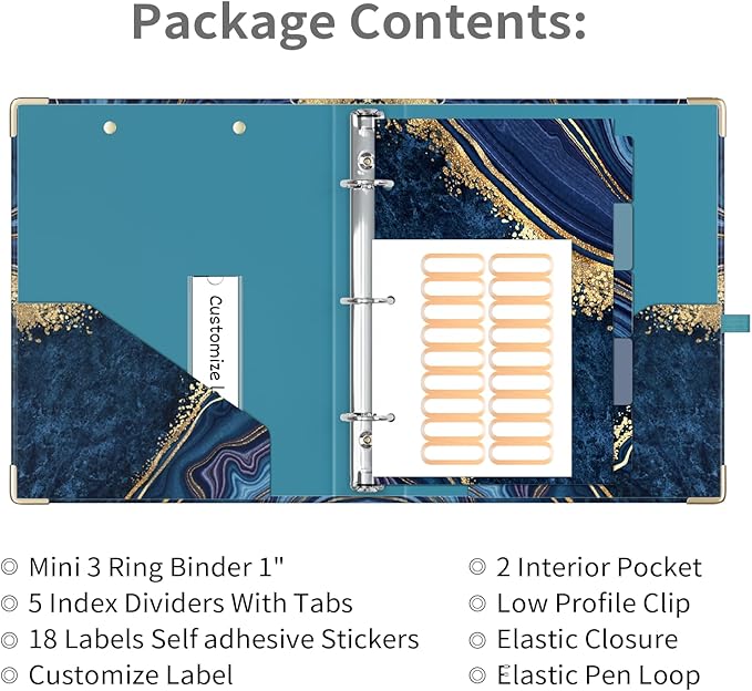 Ospelelf Mini 3-Ring Binder, 1 Inch, Cute Blue Marble Binder for 5.5" x 8.5", with 5 Tab Dividers, File Folder Labels and Low-Profile Clipboards, School and Office Supplies