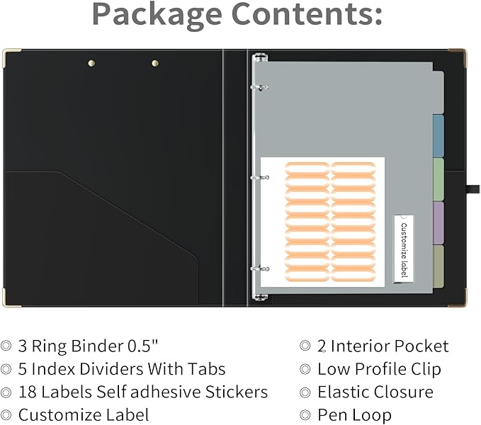 - 【Binder with Dividers】Binder comes with 5 index dividers with tabs and 18 custom label stickers for easy viewing. Features two interior pocket to store letter size papers and important loose documents.