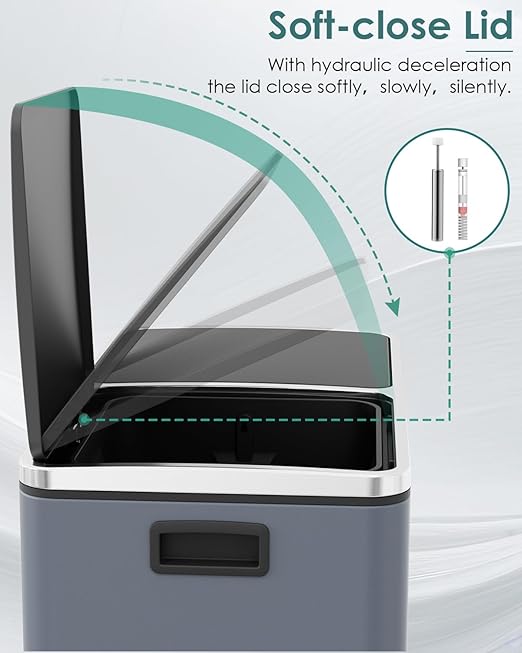- GENTLE&SEALED LIDS: 60L trash lid is designed with ABS hydraulic deceleration to close gently and silently, minimizing noise and preventing it from slamming shut. Sealed lids fit tightly to block unpleasant odors, keeps your home smelling fresh and clean.