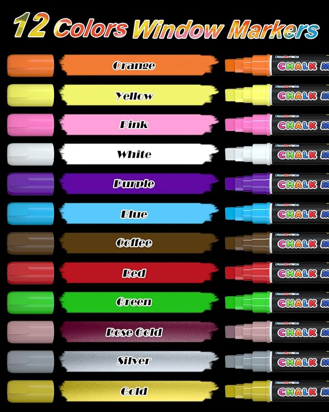 FansArriche Liquid Chalk Markers, 12 colors 10mm Erasable Marker Pens, Washable Window Markers For Glass, Blackboard, Bistro Menu, Car Windows, Mirrors, Labels, 3 In 1 large nib