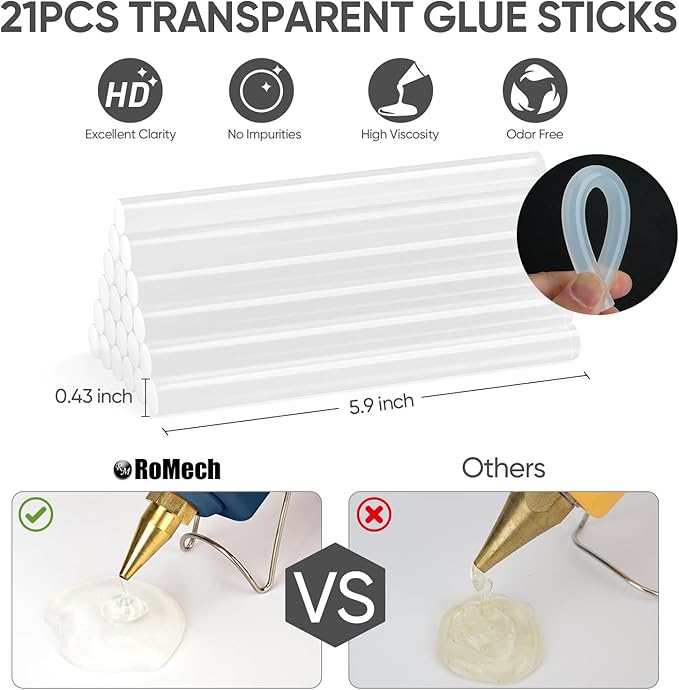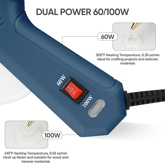 - ✅[DUAL POWER OUTPUTS] RoMech hot glue guns offer dual temperature setting, feed glue at your pace. The simple power switch allows quick temperature adaptation for all your projects. 60W is suitable for crafting projects and delicate materials, maintains 300°F heating temperature and 0.35 oz/min flow rate. 100W is ideal for wood and heavier material, heats up fast at 410°F and higher 0.53 oz/min flow rate.