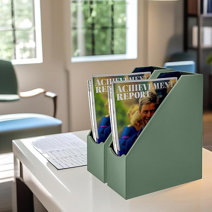 UnionBasic Magazine File Holder, Leatherette Desktop Document Organizer, Home Office Paper Holder File Storage Literature Sorter, Malachite Green, Set of 4