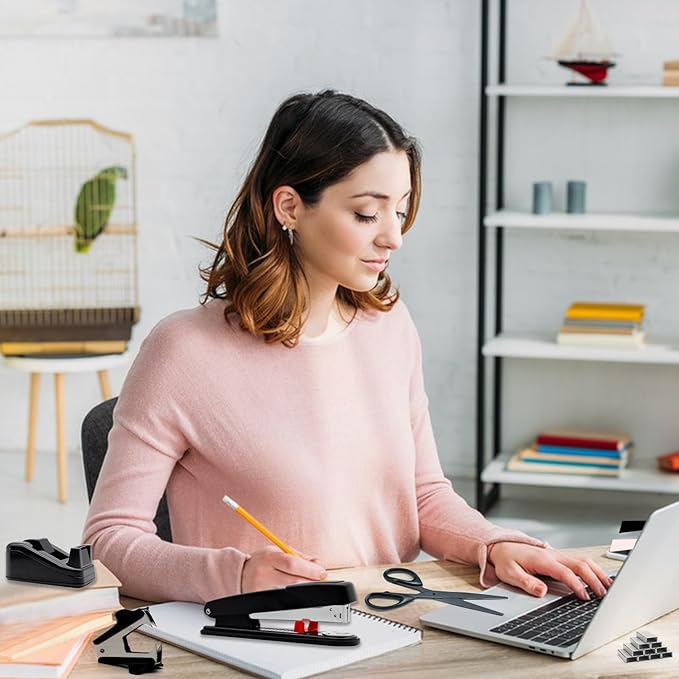 - PACKAGE INCLUDES - This black office supplies contains 1x 6.29inch Stapler , 1x Staple Remover, 1000x Staples, 1x Tape Dispenser, 1x Office Scissor, 25x Push pins 10x Big Clips 20x Small Clips 45x Paper Clips, 10 colors Tabs with ruler. Such a complete black desk accessories combination can meet your daily office and study needs.