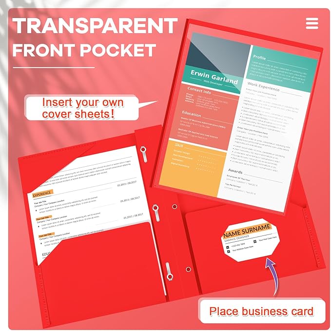 - Practical and Useful: with a clear front pocket, you can put your catalog, tables, favorite reports, presentations and more for clear display; Each plastic folder has 2 internal pockets to help organize and store your letter sized paper and documents; There are also 3 prongs to secure your 3-hole loose leaf paper in case it falls, and the card slot can hold your ID card or business card, practical for your daily work