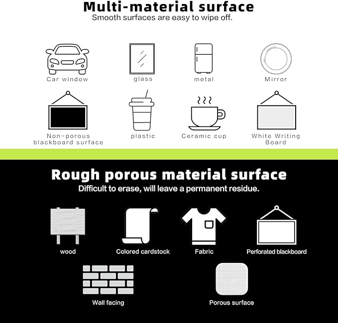 - Recommended Uses For Product : Blackboard,Car Window,Mirror,Bistro,Glass,Calendars,Labels