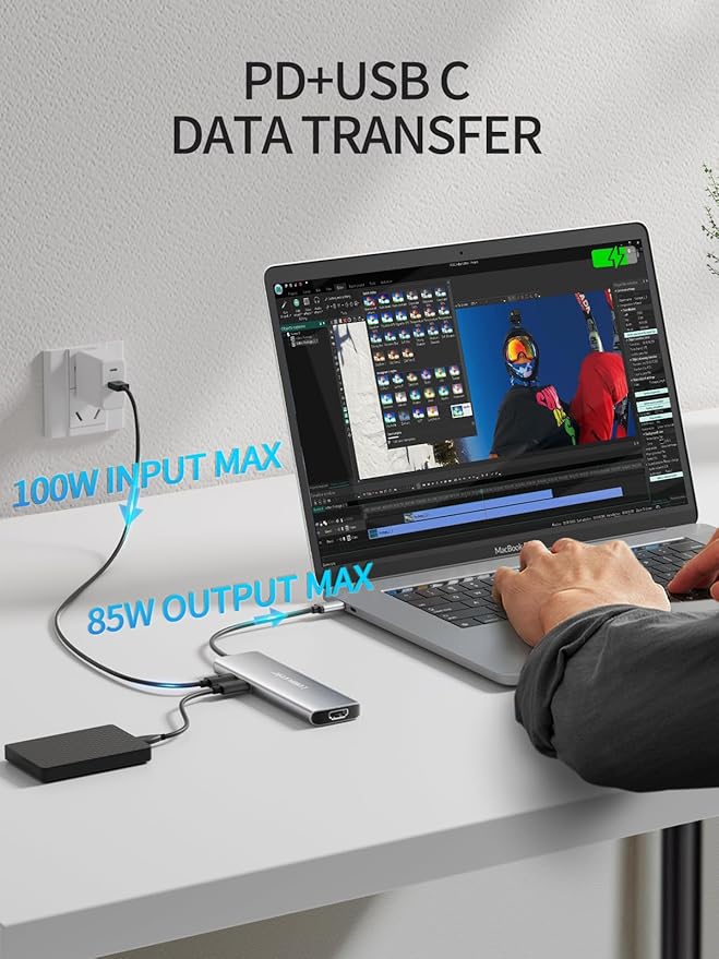 - 【HDMI 4K + PD 100 W】the usb c to hdmi hub is equipped with all the necessary functionsyou’re your daily life and general work, HDMI 4K ultra-high definition 3D video synchronization to TV, monitor or projector. 100 W fast charging as fast as the original charger, power out is limited to 87W for safety. This type c hub can provide stable power for other accessories such as hard drives while safely charging your device.