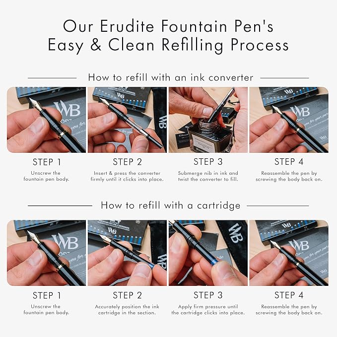 - ✒️DISCOVER THE ALL-INCLUSIVE REFILLABLE FOUNTAIN PEN SET - Includes luxurious fountain pen, ink converter, 24 Pack Ink Cartridges, and a Gift Pouch - ready to be gifted. Each calligraphy ink and fountain pen ink cartridges comes in a plastic re-closable case and will last you at least 2 weeks of regular use. With every order is a complete instruction booklet for your Wordsworth and Black Pen Set. All the information you'll need to get started using and enjoying your luxurious writing tool!