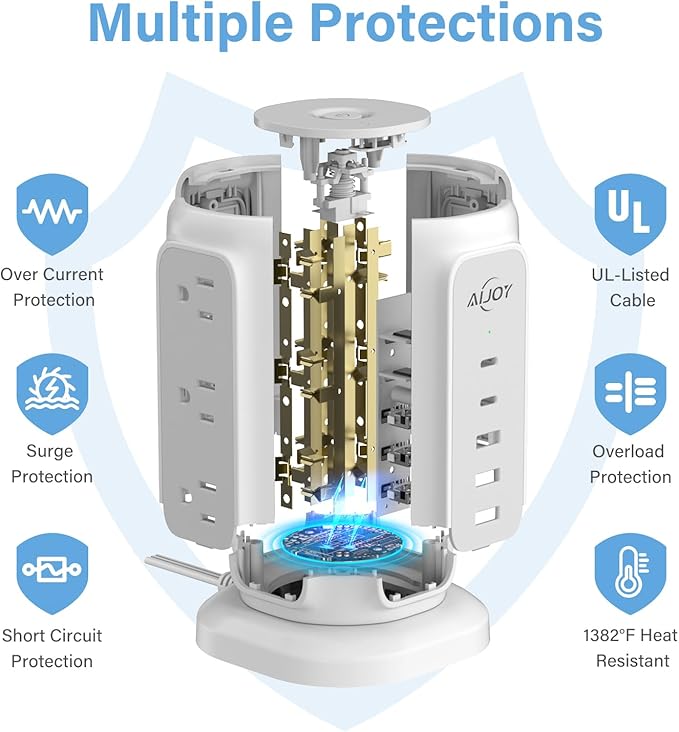 - 1200J Surge Protector Power Strip: Equipped with overload, short-circuit, over-current and surge protection; Features a fire-resistant ABS shell (1382℉), 13A circuit breaker (1625W Max), and 1200J surge protection; Includes an individually controlled power switch for easy on/off; giving you peace of mind and the convenience to manage your power usage efficiently
