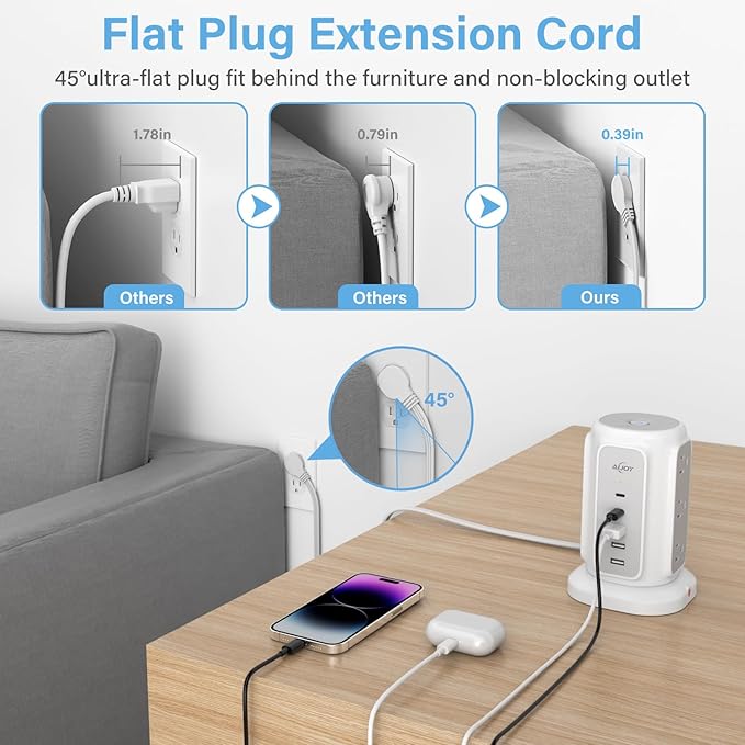 - Flat Plug Extension Cord: With 0.39-inch flat plug design and 6.5 feet thin extension cord fit in tight spaces, making it easy to hide behind furniture; The 45° right angled plug prevents blocking the second outlet; This thoughtful design maximizes outlet space, making it easier to use all the available ports, whether you're charging electronics, powering lamps, or connecting office equipment