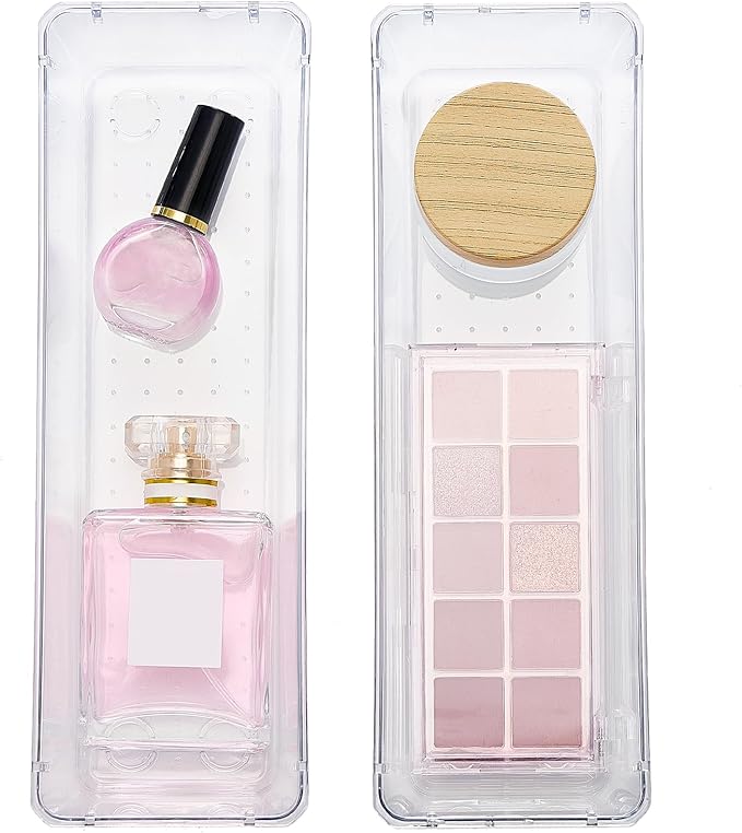 - Clear Containers for Organizing: The transparent materials of the clear organizing bins make it easier to find and retrieve item in your drawers, without having to rummage through clutter. The acrylic drawer organizer can also protect your fragile possessions such as jewelry, glassware, and electronic devices from potential damage.