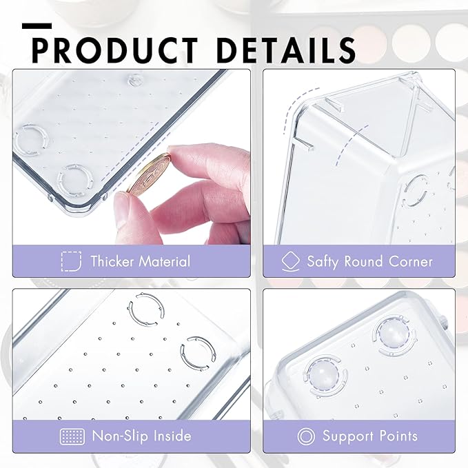 - Durable Makeup Drawer Organizer: Made of high-quality, crack-resistant plastic, the storage trays are built to last. These bathroom drawer organizers are crafted from non-toxic and eco-friendly plastic, promoting safety and sustainability. The organization bins also enhance safety by preventing sharp or dangerous items from sliding around in drawers.