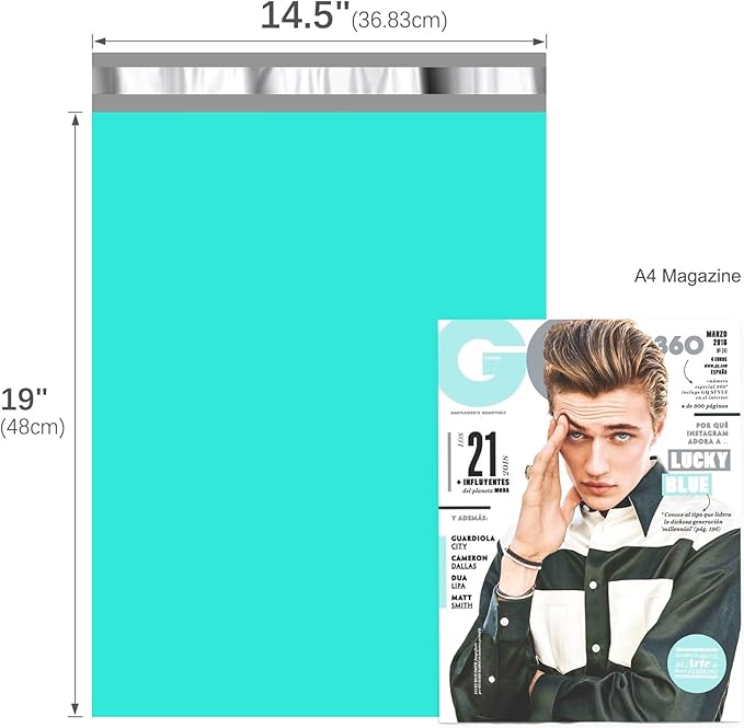 - Large Poly Mailers-The Fuxury 14.5x19 plastic shipping bags,pack of 50pcs,with teal color.The teal color makes it different,adds more colors for dull moments of shipping and life.This unique attractive color helps the parcel to stand out and your dear customer find them easily.