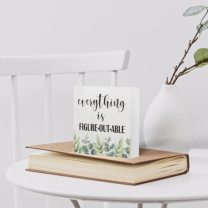 Everything Is Figureoutable Wooden Box Sign Decorative Motivational Gifts Wood Box Sign Home Office Decor Inspirational Rustic Farmhouse Square Desk Decor Sign for Shelf 5 x 5 Inches
