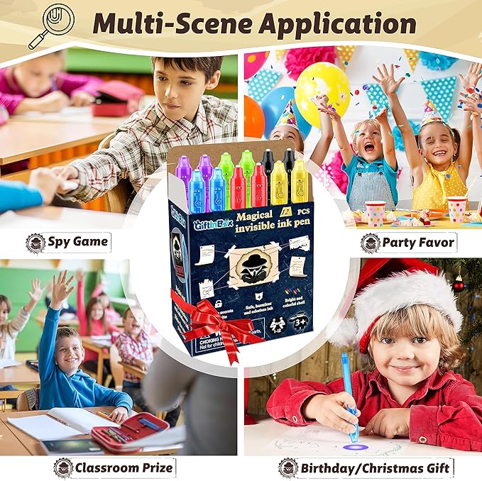 - Awesome Kids Party Favors - These glow in the dark party supplies are an ideal and unique kids party favors for kids 8-12. Suitable for any occasions like birthday parties, classroom prizes, or goodie bag stuffers. Perfect spy kit for games like the escape room, spy games, riddles, skin tattoos, etc. Whether youβre looking for a game for your kids or organizing a spy party, this invisible ink pen set will provide hours of entertainment.