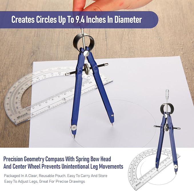 EBOOT Student Geometry Math Set, Drawing Compass and 6 Inch Clear Swing Arm Protractors 180 Degree Math Protractor (Blue)