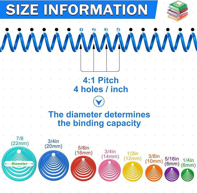 - 【4:1 Pitch & 48 Loops】Spiral Binding Coils (48 loops) are designed with a 4:1 pitch, fit any 4-holes-per-inch coil-binding machine, and letter paper is 8.5 x 11.0 inches. It helps to combine the report pages, calendars, documents, and more, providing much convenience to daily work or study. Their 4:1 pitch matches the 4-holes-per-inch punching pattern on the side of your book.