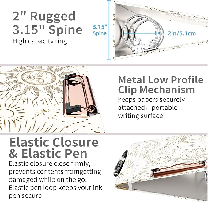 - 【Clipboard & Elastic Closure Design】Booklet-size clipboard with durable cardboard base provides a hard, portable writing surface;Low-profile clip can hold up to 100 sheets paper. In addition, the binder's elastic closure not only can close the binder firmly, but also acts as a bookmark.