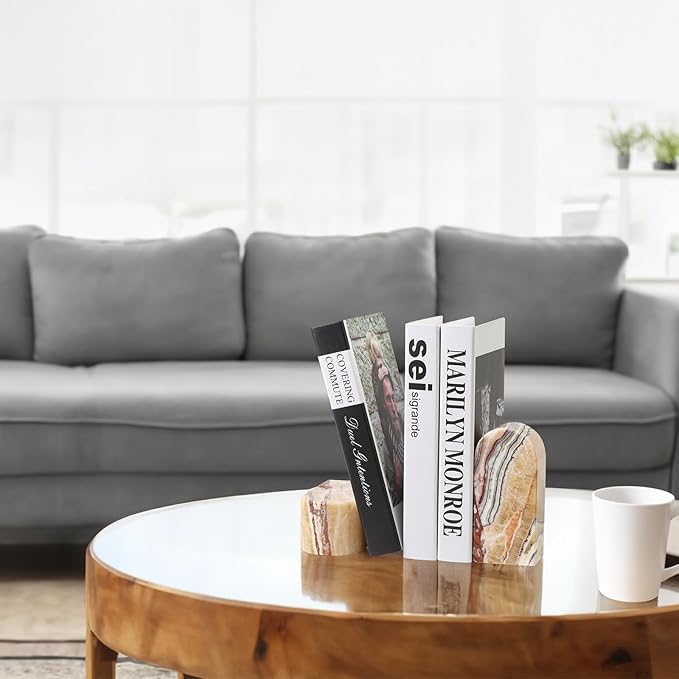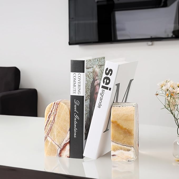 Koville Mexican Natural Marble Bookends for Shelves, Decorative Book Ends, 7lbs Heavy-Duty Marble Book Holders, Bookshelf Apartment Decor for Normal Books/CD/Video Games(Mexico Onyx)