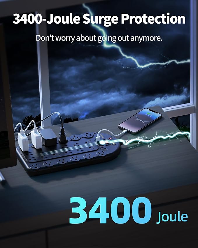 - 【Safeguard Your Devices】-It's ETL Listed. This long outlet power strip has a 3400-Joule energy rating providing a reliable surge protector to protect any meeting room, office, personal workstation, or urround sound system.