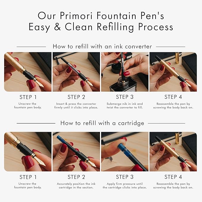 - ✒️Express Yourself Through Effortless Writing - Built to offer a delicate weight that is perfect for both left and right handed writers, this Primori fountain pen set will be your best writing tool that you carry around and bring with you everywhere. With the smooth lines, consistent flow, your lines will always glide across the page whether it is notes in your agenda or doodles on the side of a page. With zero ink leakage and cap cover, this is the perfect writer's pen.