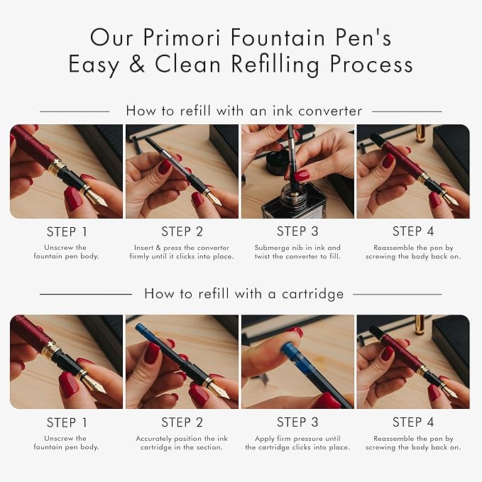 - ✒️Express Yourself Through Effortless Writing - Built to offer a delicate weight that is perfect for both left and right handed writers, this Primori fountain pen set will be your best writing tool that you carry around and bring with you everywhere. With the smooth lines, consistent flow, your lines will always glide across the page whether it is notes in your agenda or doodles on the side of a page. With zero ink leakage and cap cover, this is the perfect writer's pen.