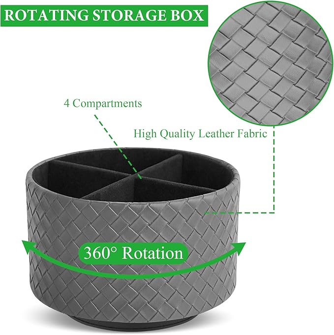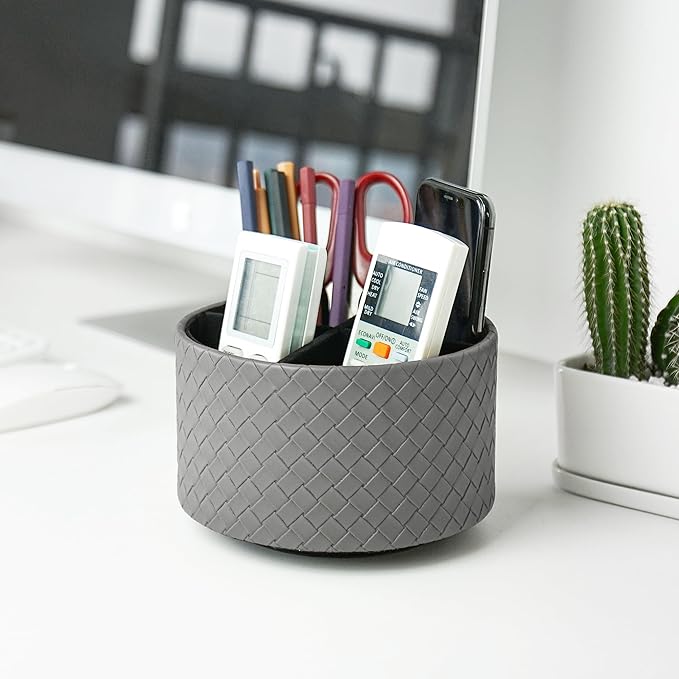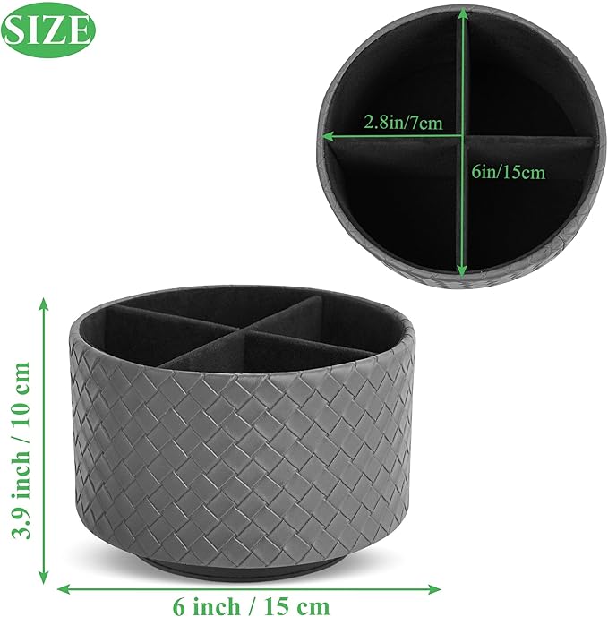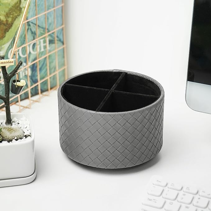 Hennaja Round Leather Art Supply Organizer,Remote Control Holder,360 Degree Spinning,Multi-Functional Pencil Holder,4 Compartments Desktop Stationary Organizer(1-Weave Grey)