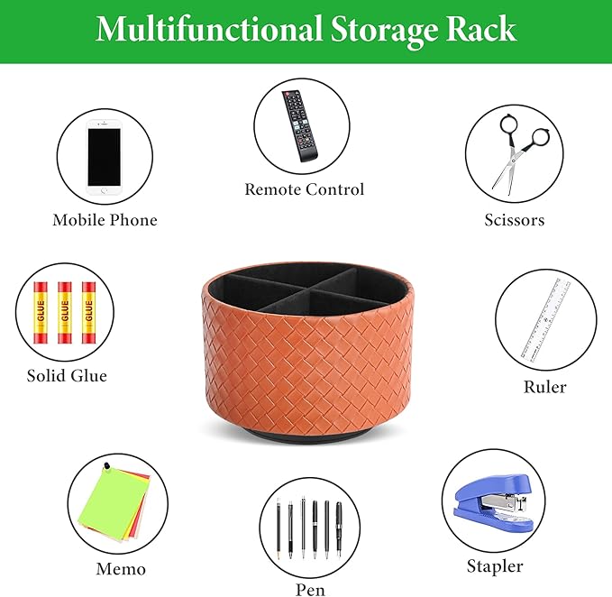 Hennaja Round Leather Art Supply Organizer,Remote Control Holder,360 Degree Spinning,Multi-Functional Pencil Holder,4 Compartments Desktop Stationary Organizer(1-Weave Brown)