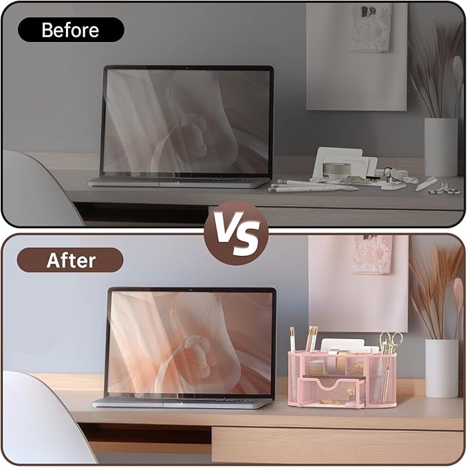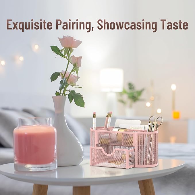 SUPEASY Mesh Desk Organizer, Desk Accessories & Workspace Organizers with Drawers, Pencil Holder for Desk with 9 Compartments for Office Suppliess, 8.6 x 4.3 x 4.1 Inch, Pink