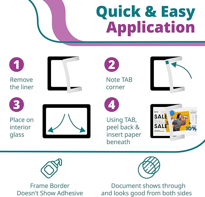 - NO DAMAGE TO GLASS SURFACES: These document holders attach with repositionable adhesive that sticks firmly to glass but removes cleanly without leaving residue or marks. Great for rental spaces or anywhere you can't drill holes. Unlike other materials that only work on metal surfaces, these work on any window or glass door. The adhesive is hidden under the black border, so all you see is your document and the frame.