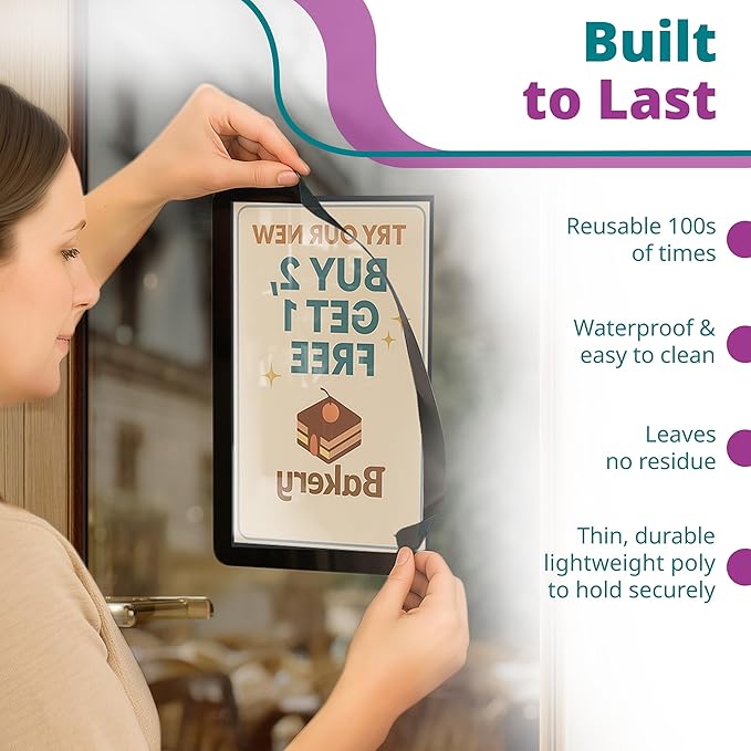 - REUSABLE UP TO 100 TIMES: Changing your sign is easy - just lift the tab corner, slide out the old paper, and insert a fresh one. The adhesive layer stays strong through about 100 uses, so you can update flyers, specials, and notices whenever you need to without buying more holders. Way more convenient than dealing with tape that loses its grip. Fits the standard letter-size paper (8.5 x 11 inches).