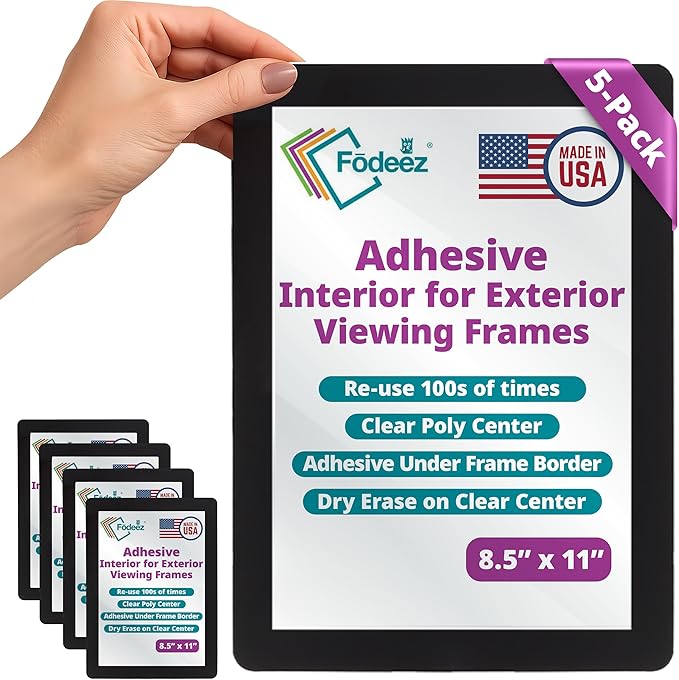 Letter-Size 8.5 x 11 Adhesive Interior for Exterior Viewing Frames - Reusable Sticker Holder Display for Windows & Doors, Paper Holder, Dry Erase, Non Acylic & Non Magnetic - Black, Pack of 5