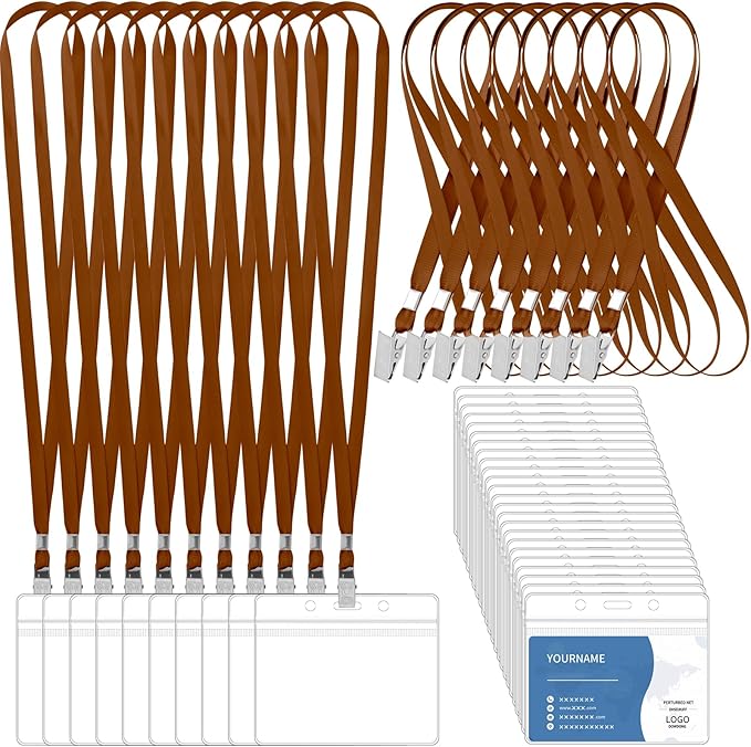 100 Pcs Lanyards for ID Badges and 100 Pcs Clear Name Tag Holders Reusable Lanyard with Clip Plastic ID Card Badge Holder Name Badges for Adults Kids Business School Office Supplies (Brown)