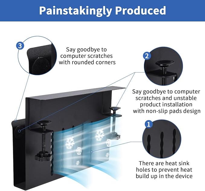 - No Drilling & Easy To Install: Our under desk laptop mount, desk side laptop holder is easy to install. And the silicone cushion can prevents scratches on desks and other objects, the rounded corners design can also avoid scratches. No extra tools are needed and importantly it won't damage your desk. It only took you 2 minutes to install our clamp on desk organizer to your desk